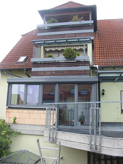 Ausführung: Alu-KunststoffkonstruktionBesonderheiten: Wintergarten und Terrassendach mit Stauraum für PolsterungBaujahr: 2009