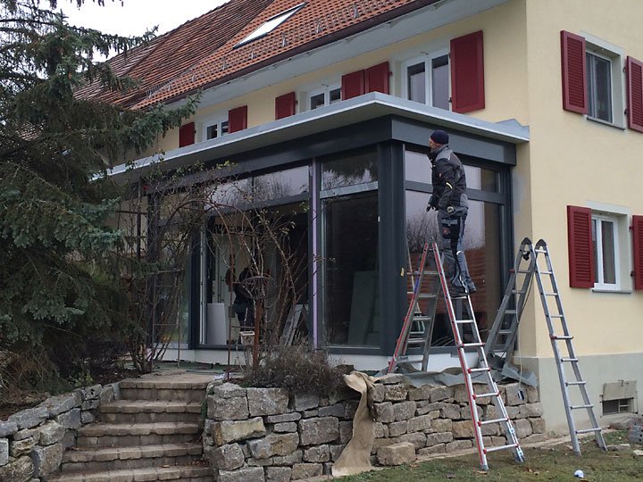 Ausführung: Aluminium-HolzBesonderheiten: Mit Flachdach und gleichzeitiger EingangsüberdachungBaujahr: 2014