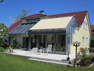 Weit verbreitet ist der textile Sonnenschutz mit einer breiten Palette an Dessins. Die Gewebebahnen verlaufen in seitlichen Führungsschienen. Fassadenmarkisen sind für den senkrechten Bereich gedacht, können aber auch bei Dächern über 30 Grad Neigung eingesetzt werden. Für flachere Dachneigungen sind spezielle Wintergartenmarkisen mit Gegenzug entwickelt worden. Gebogene Komplettanlagen, die Dach und Fassade in einem Zuge verschatten, haben den Nachteil, dass z. B. eine Fassadenabdeckung als Sichtschutz immer auch den Ausblick in den Himmel verdecken. Geteilte Systeme sind also gezielter einsetzbar.