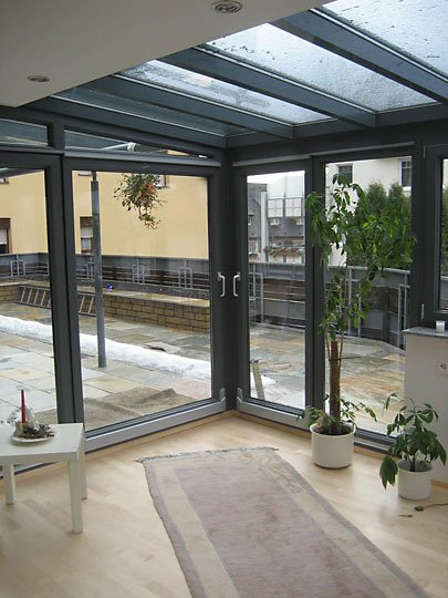 Ausführung: Alu-KunststoffkonstruktionBesonderheiten: Wintergarten und Terrassendach mit Stauraum für PolsterungBaujahr: 2009
